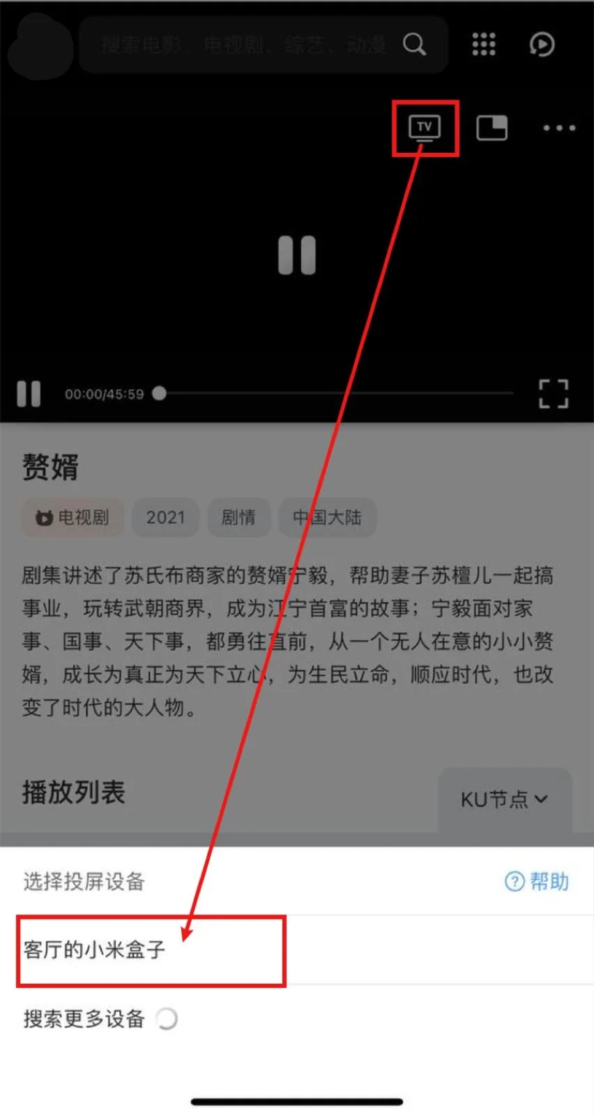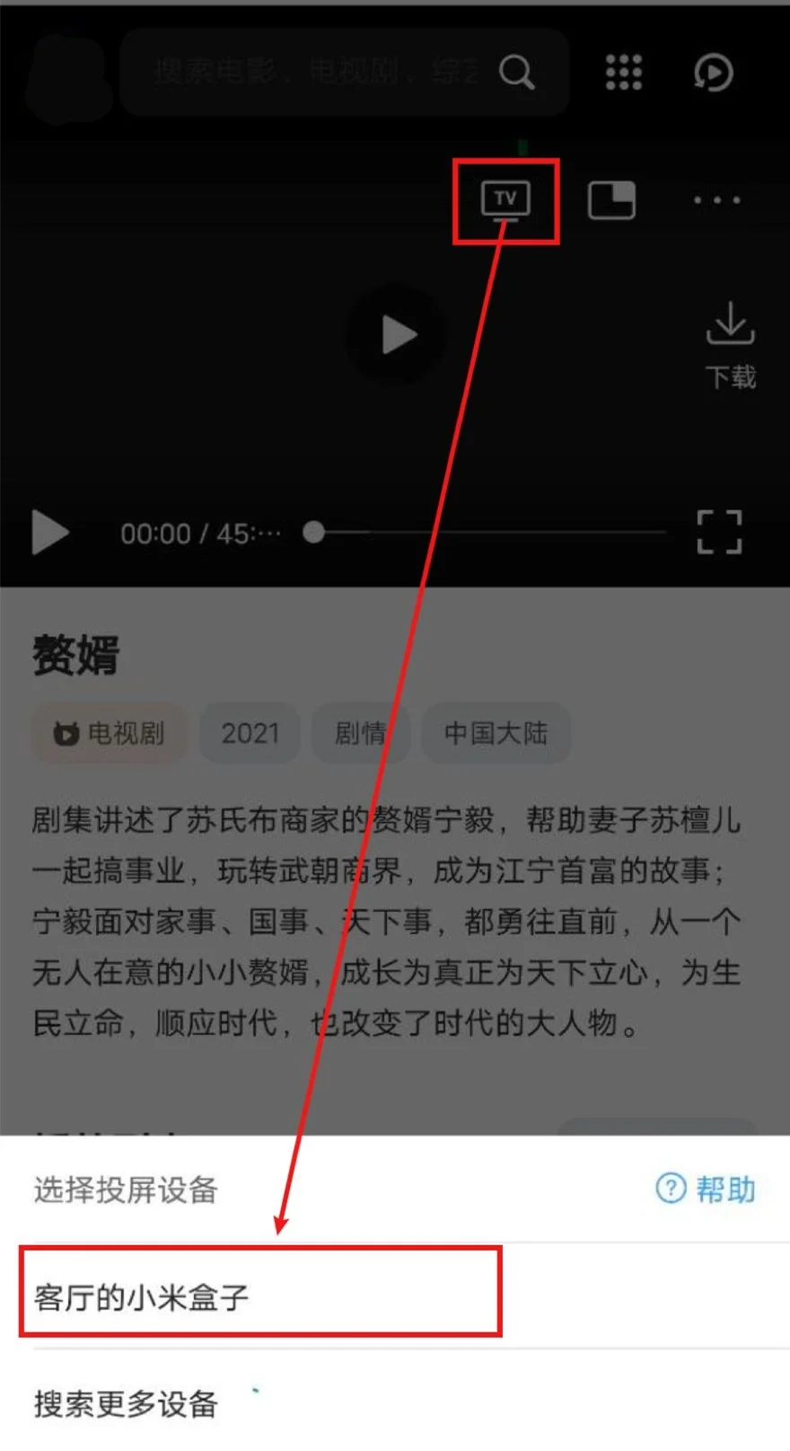 打开QQ浏览器(会接管网页播放器)->打开爱看影视 - 免费短视频分享大全->播放视频->选中投屏图标->等待搜寻出智能电视/电视盒子->选中,即可投屏。